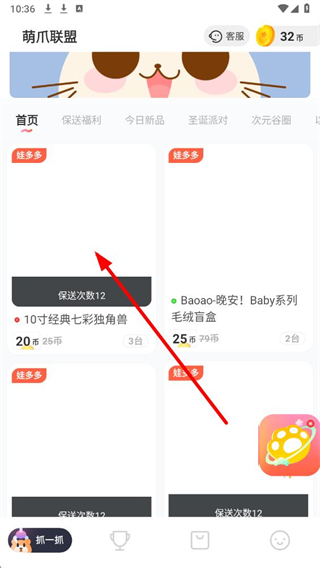 1、打开萌爪联盟app,在首页选择目标玩偶,点击对应区域进入玩偶机列表。