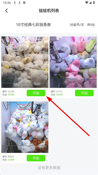 2、在玩偶机列表中,找到目标玩偶对应的空闲娃娃机,点击开始按钮,进入该玩偶的抓娃娃操作页面。