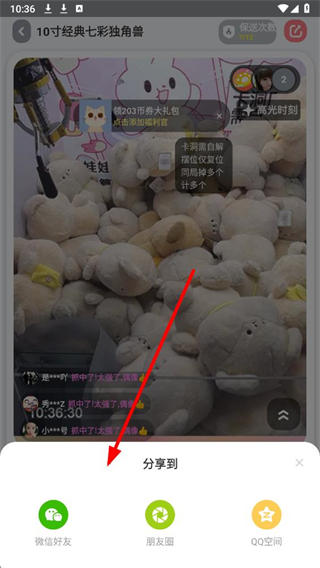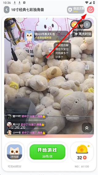 3、在抓娃娃操作页面,找到右上角的分享图标,该图标为箭头样式,点击后弹出分享到的选项菜单。