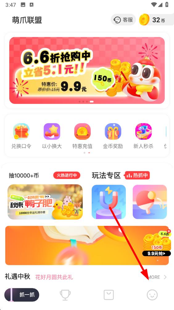 1、打开萌爪联盟app,进入主界面,点击底部导航栏中的个人图标,进入个人界面。
