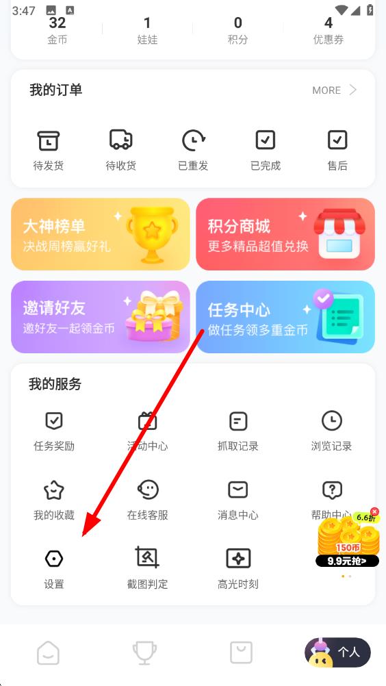 2、在个人界面中,向下滑动页面,找到并点击设置选项,进入设置页面。
