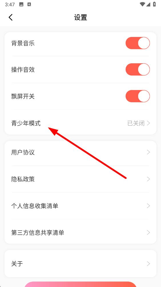 3、在设置页面里,找到青少年模式选项并点击,进入青少年模式设置界面。