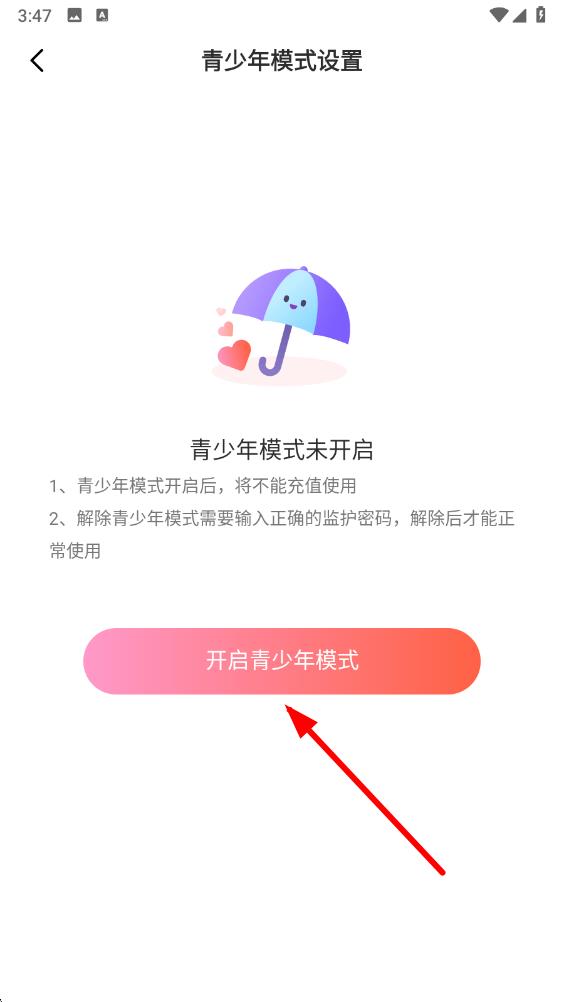 4、在青少年模式设置界面中,点击开启青少年模式按钮,按照提示操作后,即可成功开启青少年模式。