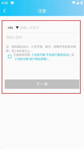 3、在注册页面填写信息并勾选协议后,点击下一步完成注册。