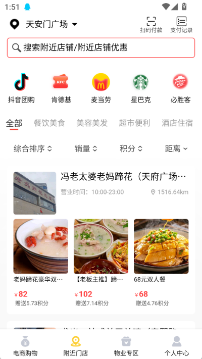 可以根据你的定位位置,搜索附近热门的门店,可以根据销量、积分、距离等选项进行筛选,帮你寻找好店