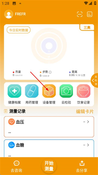 2、在健康数据页面点击设备管理选项,进入设备列表页面。