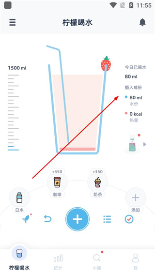 3、返回主页面后,即可查看今日已喝水量等数据。