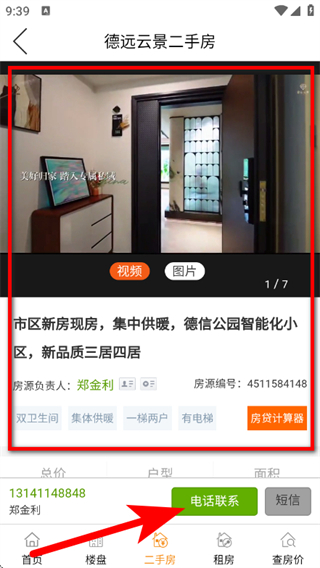 3、在房源详情页面,查看房源户型等信息,点击电话联系,可与房源负责人沟通。