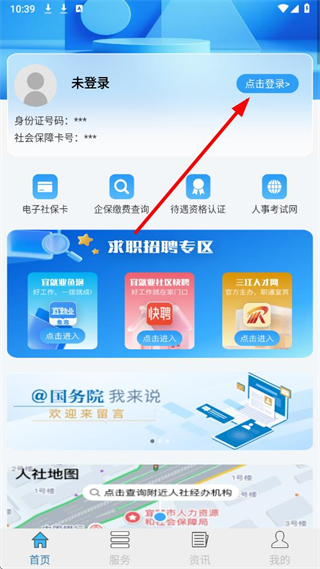 1、打开宜宾人社APP后,在首页找到点击登录按钮并点击,进入登录相关界面。