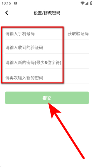 5、在设置修改密码页面,输入手机号码和验证码,设置新密码,点击提交,完成密码重置。