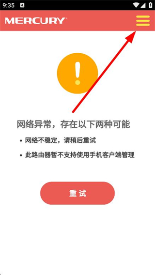 1、打开水星路由器,点击右上角的菜单按钮。