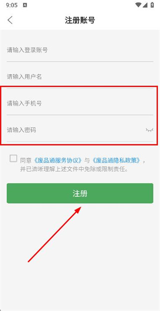 3、在注册账号页面填写手机号和密码,勾选协议后点击注册按钮完成账号注册。