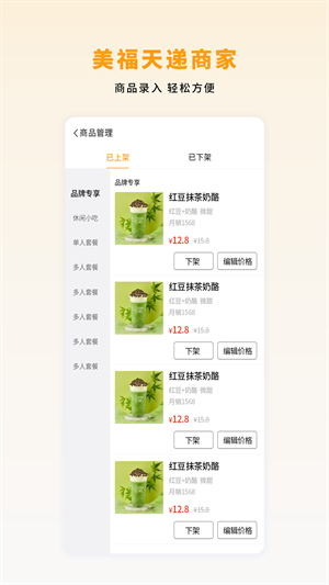 美福天递商家是一款专为外卖商家的平台,在这里可以轻松管理自己的外卖店铺,轻松接单完成外卖制作,所有的退款、用户订单都能在线处理,随时管理店铺中的外卖美食商品,每天的收入可以看得见,让大家可以轻松在线管理自己的订单。