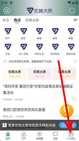 1、打开优简太原,点击底部个人中心,进入个人中心页面。