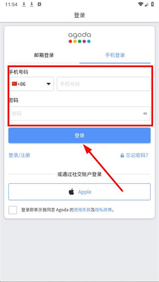 3、在手机登录界面选择地区,输入手机号及密码,勾选同意协议后,点击登录按钮,完成手机号登录操作。