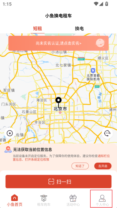1、首先打开下载好的小鱼换电租车app,进入软件后点击界面右下角【个人中心】选项;