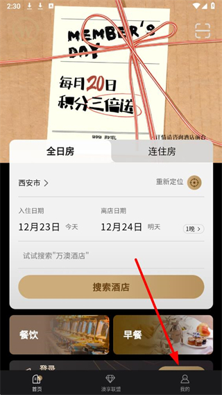 1、在万澳会app的首页界面中,点击底部我的选项,进入个人相关操作页面。