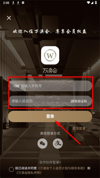 3、在登录界面中,填写手机号,获取验证码,最后点击登录完成账号登录。