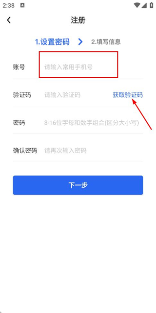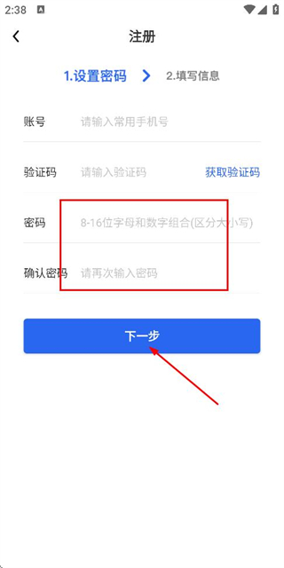 3、在注册账号页面填写验证码和密码,点击下一步进入填写信息页面。