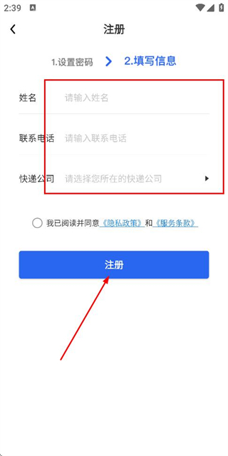 4、在填写信息页面填写对应信息后,勾选条款点击注册完成注册操作。