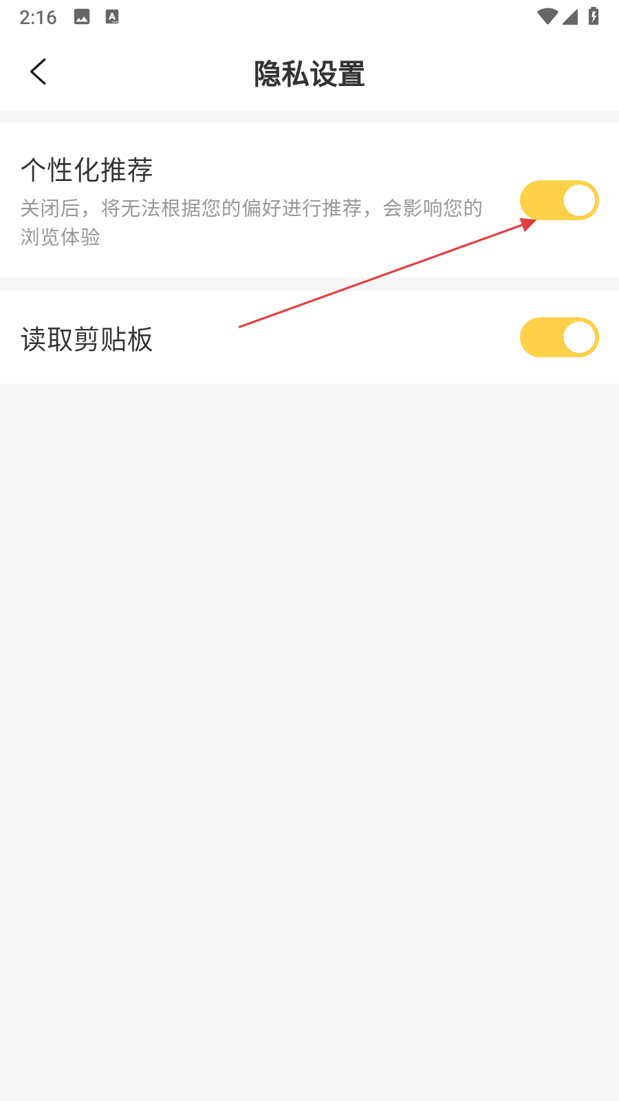 4、在隐私设置页面,找到个性化推荐,点击其右侧的开关按钮,即可关闭个性化推荐功能。