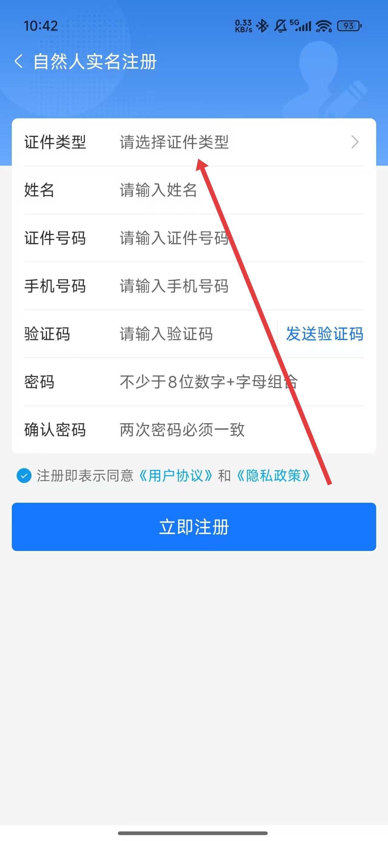 4、跳转到注册页面后,点击选择证件类型后填写后续信息,完成注册操作。