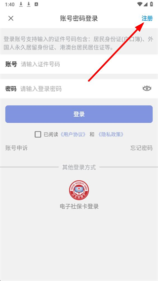3、在登录页面的右上角,找到注册按钮并点击,进入电子社保卡注册的信息填写界面。