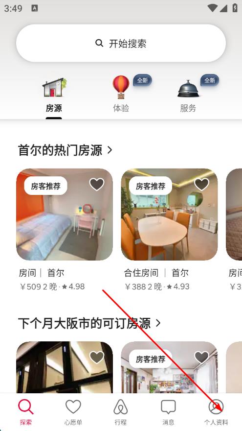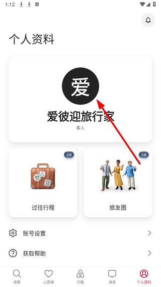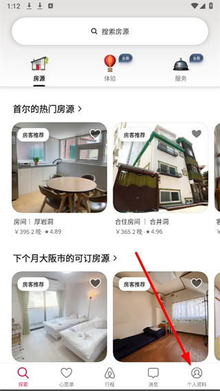 1、打开爱彼迎应用,点击底部导航栏中的个人资料图标。