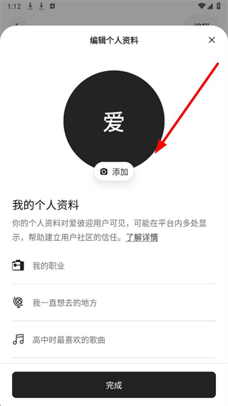 4、在编辑个人资料界面,可修改头像、职业等信息,完成后点击完成保存设置。