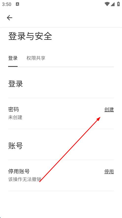 4、在登录与安全页面,点击密码右侧的创建按钮。