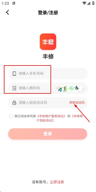 2、在登录页面填写手机号和图形码,勾选协议后,点击获取验证码。