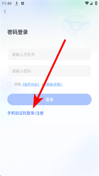 3、在密码登录界面,点击手机验证码登录注册,切换短信登录界面。