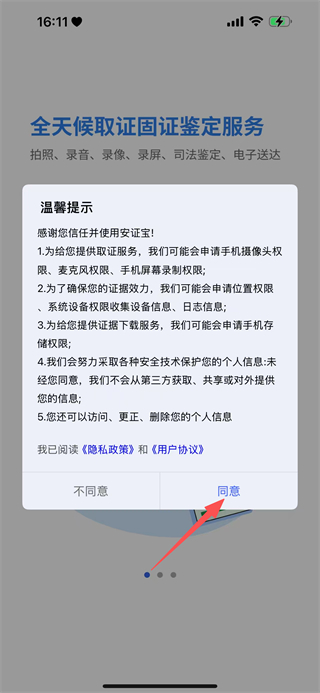 1、阅读隐私政策和用户协议后,点击同意,进入安证宝应用。