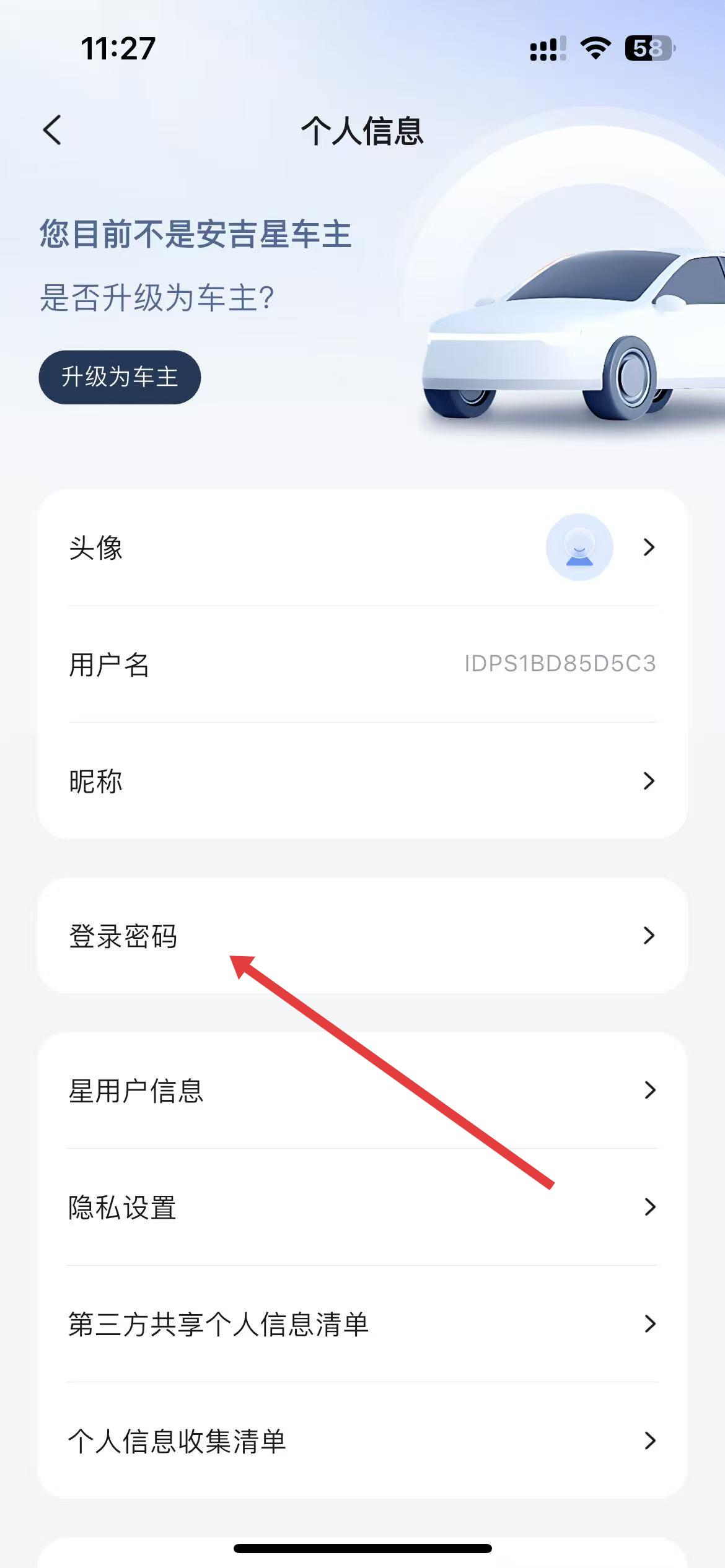 3、在个人信息界面中,找到并点击登录密码选项,进入更改密码页面。