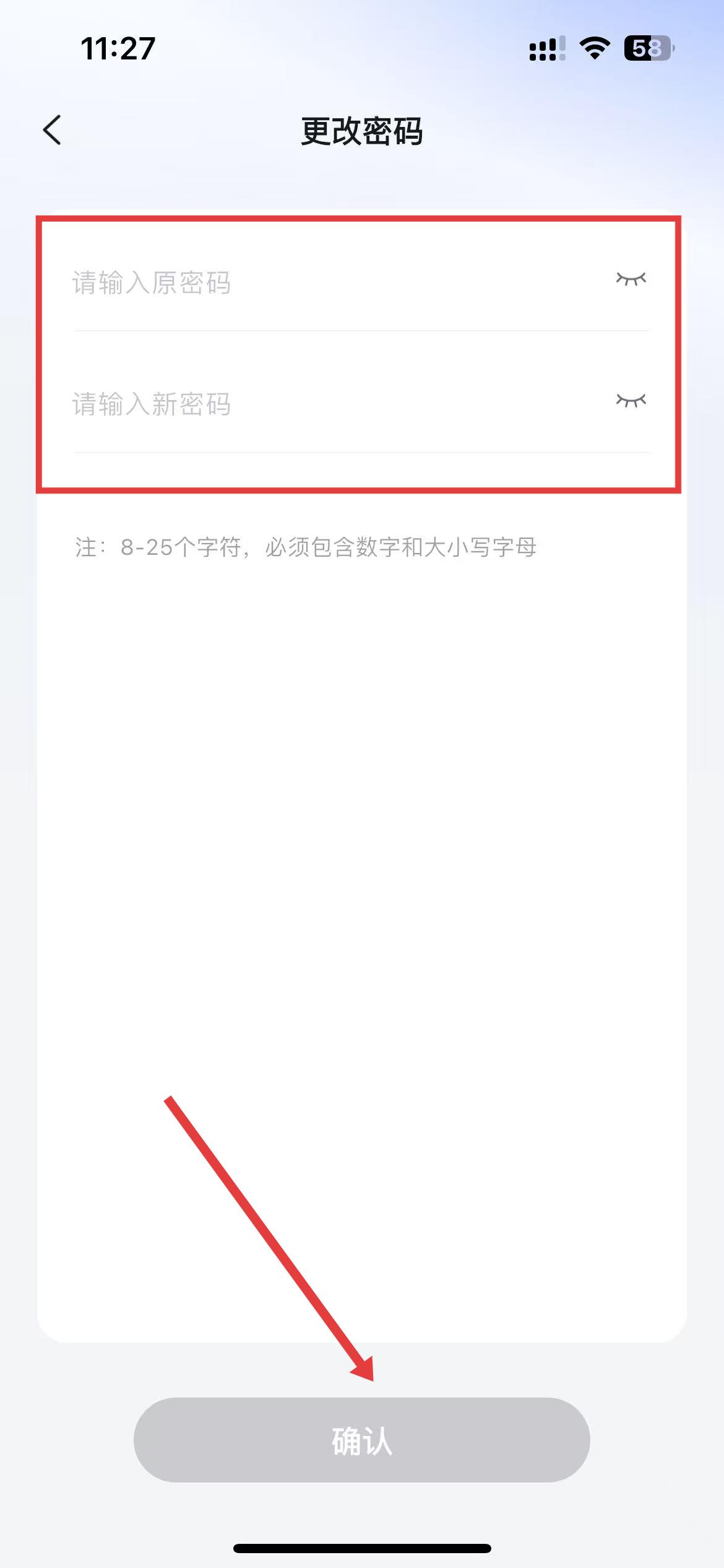 4、在更改密码页面,按要求输入原密码和新密码,输入完成后点击确认即可。