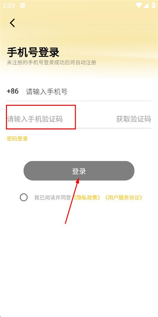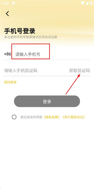 2、在登录页面填写手机号,勾选协议后,点击获取验证码。