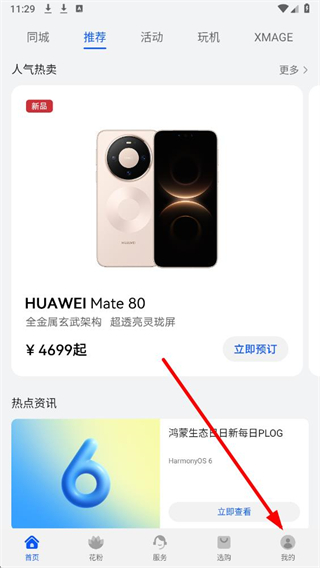 1、进入我的华为app,点击首页底部我的选项,进入个人页面。