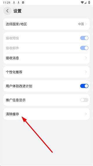 3、在设置页面里,选择清除缓存选项,触发清除缓存的确认弹窗。