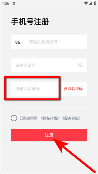 4、在请输入验证码框,输入验证码,点击注册,完成账号注册。