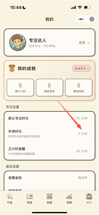 2、在个人中心页面,点击休息时长选项,可打开选择休息时长的弹窗。