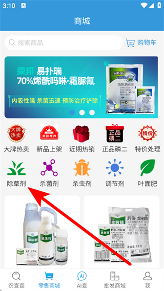 2、在商城页面,点击选择除草剂分类,进入除草剂商品列表页面。