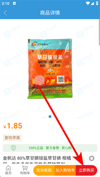 4、在商品详情页面,点击底部立即购买,进入农资商品的购买流程。