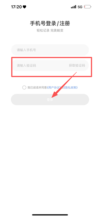 3、在登录/注册页面,填写输入验证码,点击登录按钮,完成登录。