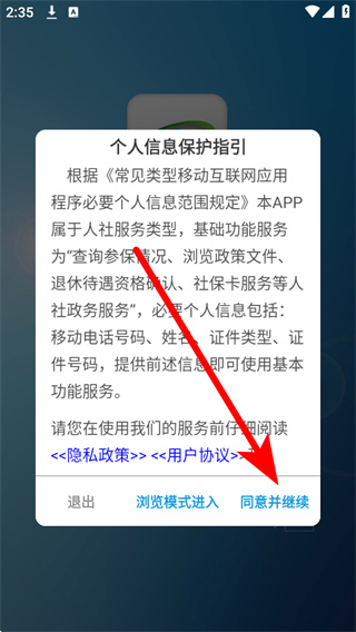 1、打开云南人社12333App,在页面点击同意并继续,进入应用主界面。