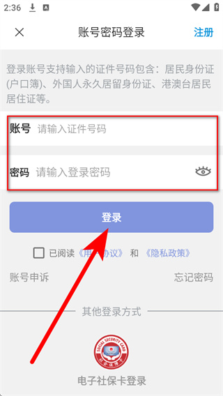 4、在账号密码登录界面,填写账号和密码,勾选相关协议,点击登录完成登录。