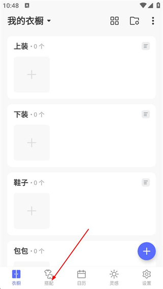 1、在尽简衣橱首页,点击底部的搭配选项,切换至搭配分类页面。