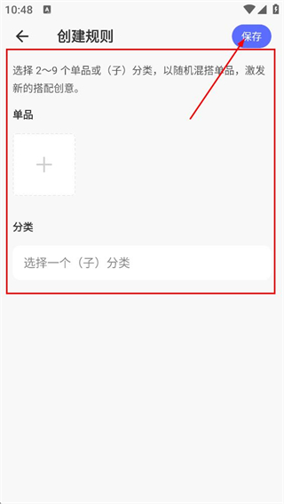 5、在创建规则页面,选择单品和分类,点击右上角的保存,完成随机搭配规则的创建。