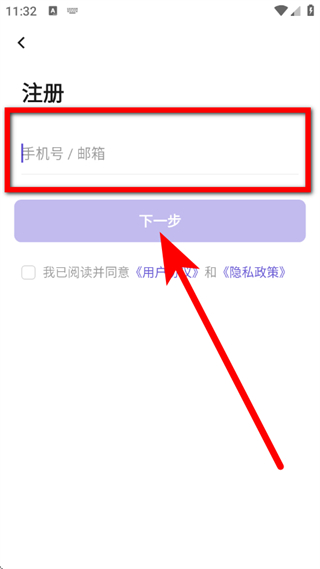 3、在注册页面,输入手机号或邮箱,勾选后,点击下一步。