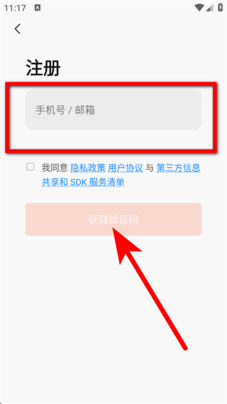 3、在注册页面,输入手机号或邮箱,点击获取验证码。