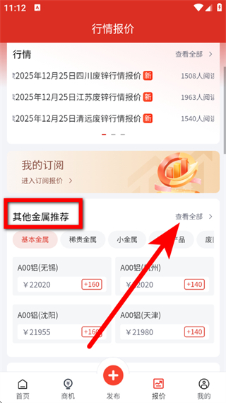 2、在行情报价页面,点击右侧的查看全部,进入其他金属页面。